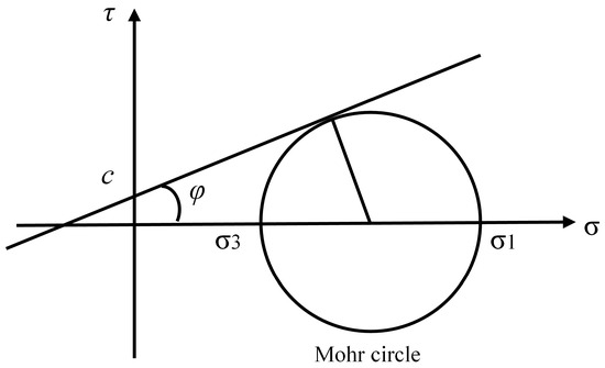 The Mohr–Coulomb strength theory was proposed by the German engineer Christian Otto Mohr (1835–1918) in 1900. This theory holds that the main reason for the shear failure of materials is that the shear stress on a certain section reaches the ultimate strength value, but it is also related to the normal stress on that section. If there is compressive stress on the section, the internal friction force of the material related to the magnitude of the compressive stress will prevent the sliding of the section; if there is tensile stress on the section, the section will slide easily, so the shearing does not necessarily occur on the section with the maximum shear stress. In the three-dimensional stress state, if the influence of the intermediate stress on the material failure is not considered, the maximum or relatively large shear stress at a point can be determined by the stress circle drawn by the maximum and minimum principal stresses and . The stress circle when the material fails is called the “ultimate stress circle”. According to different ratios of and (such as uniaxial tension, uniaxial compression, pure shear, triaxial compression tests with various stress ratios of different magnitudes, etc.), a series of ultimate stress circles can be drawn. The common envelope of these stress circles is the critical line for material failure. It was proposed by the French physicist Charles Augustin de Coulomb (1736–1806) in 1773. Assuming that the ultimate strength value is a linear function of the normal stress on the same plane, the envelope can be simplified into a straight line, as shown in Figure 2, and it is often called the Mohr–Coulomb strength theory or Coulomb strength theory. The Mohr–Coulomb strength theory can comprehensively reflect the strength characteristics of rocks and soils (for example, the tensile strength of rocks and soils is far less than their compressive strength). This theory is applicable to both brittle materials and plastic materials [34,35].