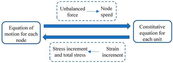 FLAC3D7.0 is a three-dimensional finite difference software that applies the Lagrangian fast algorithm and was developed by Itasca Consulting Group, Inc. Minneapolis, MN, USA based on the FLAC2D5.0. The so-called finite difference method was the first numerical simulation calculation method adopted by computers and has been in use ever since. It is a convenient and straightforward numerical method that converts differential equations into algebraic forms [38]. The Lagrangian fast finite difference method is a type of finite difference method. Compared with the reduced integration method used in the finite element method, it adopts a more accurate and logical mixed discretization method, which can better simulate the material yielding and plastic flow characteristics. When dealing with huge amounts of model data, the finite difference method occupies less memory. Therefore, FLAC3D7.0 is widely used in slope geotechnical engineering to calculate the large deformation and failure of geotechnical materials. The calculation cycle of FLAC3D7.0 is shown in Figure 3.