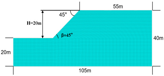 The distribution of each energy increment is developed to display as a contour through FLAC3D7.0 to visualize the energy, based on the energy calculation principle of slope catastrophe procedure established by our research group. Its correctness is verified in the classical slope calculation example. According to related studies, the classical two-dimensional slope of Figure 4 is quoted for numerical simulation. The model slope height H = 20 m, slope angle β = 45°, width 1 m, a total of 3400 elements, gravity γ = 20 kN/m3, elastic modulus E = 100 MPa, Poisson’s ratio υ = 0.3, initial cohesion c = 42 kPa, friction angle φ = 17°, and Mohr–Coulomb principal model. Taking F0 = 0.6 as the initial reduction factor [7]. The various stages of slope catastrophe are simulated. The change rules of energy increment field with the reduction factor are then analyzed.