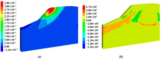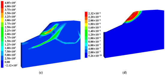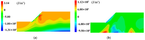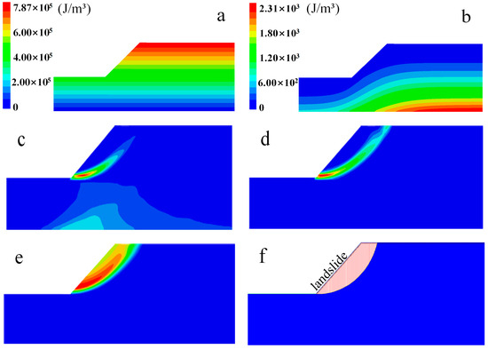 When the reduction factor increases from 0.6 to 0.8, and the slope is in the self-equilibrium stage. The distribution of the internal gravity potential energy loss field and elastic strain energy increment field are shown in Figure 5a,b. It can be seen that the gravity potential energy loss field shows a layered distribution in the height direction and the value increases uniformly with height. The elastic strain energy increment field is largest at the bottom of the slope, and smallest at the top and face of the slope. Its distribution principle conforms to the theoretical calculation results. This proves that the gravity potential energy loss field and elastic strain energy increment field calculated by the energy visualization procedure are correct.