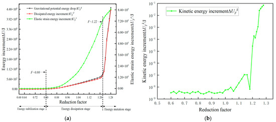 The evolution of each energy increment with the reduction factor during slope catastrophe is shown in Figure 6. At the stage with reduction factor F = 0.60 to F = 0.80, the energy increment does not change with the increase in the reduction factor. At the stage with reduction factor F = 0.81 to F =1.21, the energy increment starts to change with the increase in the reduction factor. At the stage with reduction factor F > 1.22, the energy increment changes abruptly with the increase in the reduction factor. According to the principle in the graph, the slope catastrophe procedure can be divided into three stages, i.e., the energy stabilization stage from F = 0.60 to F = 0.80 of the reduction factor, the energy dissipation stage from F = 0.81 to F = 1.21, and the stage of energy mutation from F > 1.22.