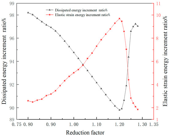 The elastic strain energy increment and dissipation energy increment can be divided by the gravitational potential energy loss, respectively, to obtain their percentage as shown in Figure 7. At the energy dissipation stage, the percentage of elastic strain energy increases, and the percentage of dissipated energy decreases. At the energy mutation stage, the percentage of elastic strain energy decreases, and the percentage of dissipated energy increases. This is because during the energy dissipation stage, the elastic parts in the slope body will exert a restraining effect on the development of the surrounding plastic strain. Under such circumstances, more slope units begin to enter the elastoplastic state and thus start to store energy. In this process, the rate of increase of elastic strain energy exceeds that of dissipated energy, which leads to a tendency for the relative proportion of elastic strain energy in the total energy to increase.