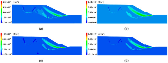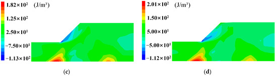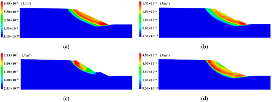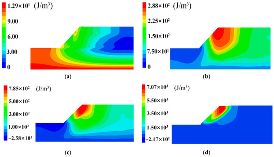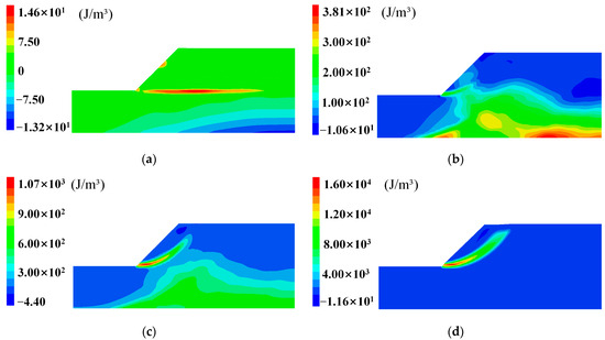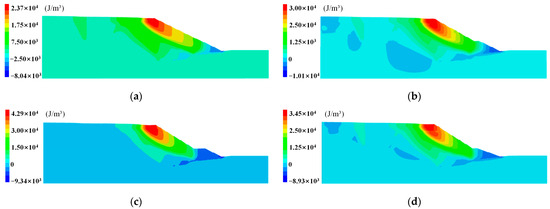 The increment of dissipated energy in slope with different schemes at critical state/J/m3: (a) scheme A; (b) scheme B; (c) scheme C; (d) scheme D.