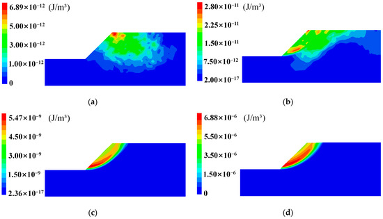 The dissipated energy increment field at each stage is shown in Figure 10. The distribution patterns of dissipated energy increment and elastic strain energy increment during slope disasters correspond to each other before failure occurs. Unit damage or deformation recovery through displacement releases the stored elastic strain energy internally, and this energy is dissipated and released. However, since part of the input gravitational potential energy is converted to other energy dissipation, the dissipated energy distribution pattern is more obvious.