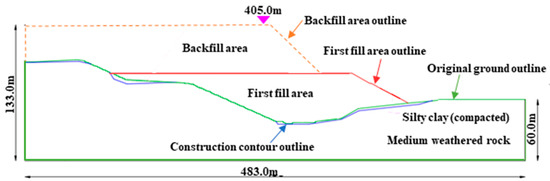 This phase of the project is divided into soil-rock fill area and backfill area. According to the specification, hazardous cross slopes at the ground line are treated with 1:2 slope release. The slopes are inclined inward with a gradient of 5.0%. The protection distance of the highway is taken as 30 m. In order to simplify the calculation model, the bedrock part is considered as a moderately weathered rock layer. The typical cross-sectional model is shown in Figure 12, with a total height of 133 m, a bottom line width of 483 m, and a thickness of 1 m.