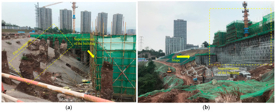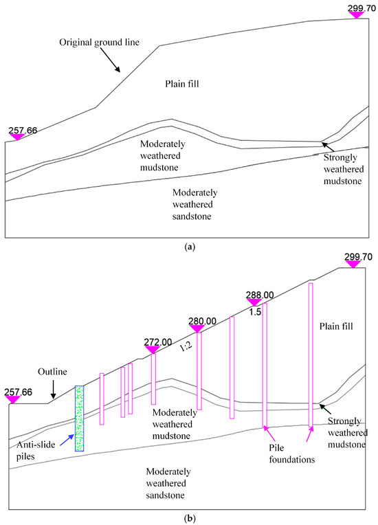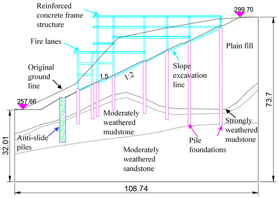 During the construction procedure, the stress and strain states of slopes and building structures will constantly change. According to the construction sequence, the engineering is divided into four working conditions: original slope, slope excavation and support, building structure construction, and building structure operation. Among them, the geometric models for the fourth and third working conditions are the same, but the fourth condition requires consideration of the load effects during the operational period. A cross-section of each working condition is shown in Figure 20.