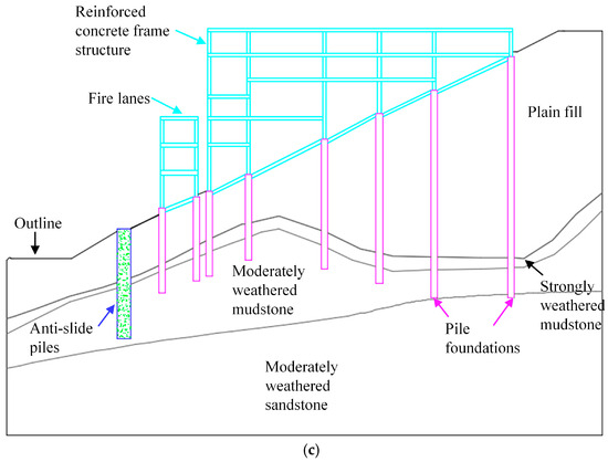 Cross-section graph of different operating conditions/m: (a) cross-section graph of the original slope; (b) cross-section graph of slope excavation and support; (c) cross-section graph of building structure construction and operation.