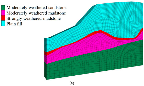 With reference to similar engineering experiences and the synthesis of engineering characteristics, the four fill schemes A, B, C, and D are proposed. The design parameters of different schemes are shown in Table 3, and the calculation parameters are shown in Table 4, and its numerical model is established as shown in Figure 13. Due to the excessive number of 3D model elements, the computation time is overly long. Therefore, based on the theory of elastic mechanics, the slope stability issue is simplified to a plane strain issue. To avoid the model stopping calculation due to excessive deformation of elements in FLAC3D7.0 large deformation mode calculation, a triangular element mesh was adopted. In order to improve the calculation accuracy, the mesh of the fill body part was encrypted. The upper area of bedrock is the slope of the first fill area, which is filled the first time by default. The backfill area is divided into different parts according to the fill layers. To consider the silty clay layer between the bedrock and the filling body, a separate silty clay layer was established according to the stratigraphic boundary when establishing the numerical model. The overall stability of the slope at Qingshangou is good. All models adopted the Mohr–Coulomb elastoplastic constitutive model as a whole. Y = 0 m and Y = 1 m are the boundary constraints for the Y-direction displacement. The bottom is a fixed boundary that constrains all displacements. The boundary surfaces of X = 0 m and X = 483 m constrain the X-direction displacement. The mechanical parameters of each layer in the model are shown in Table 4.