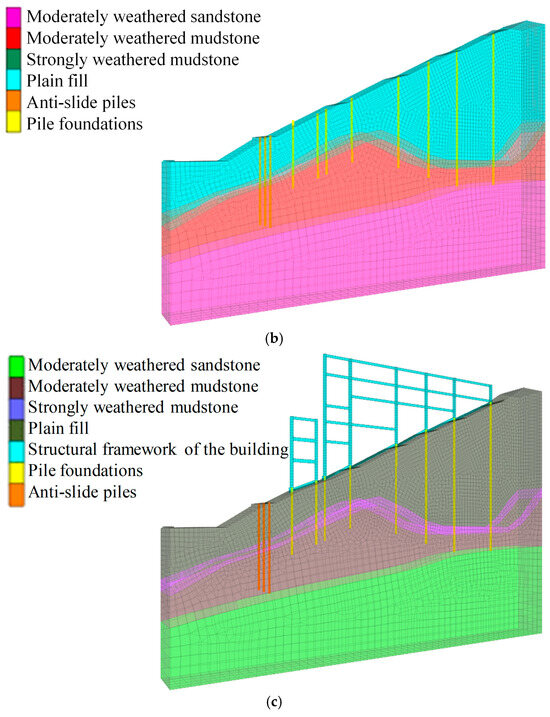 Numerical model graph for different working conditions: (a) model of the original slope stage; (b) model of slope excavation and support stage; (c) model of building structures construction and operation stage.