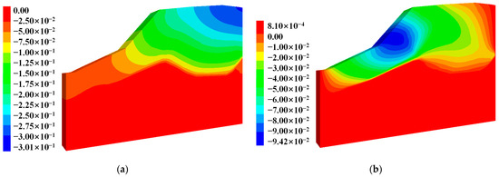 Displacement contour of the original slope when equilibrium of geostress/m: (a) vertical displacement; (b) horizontal displacement.