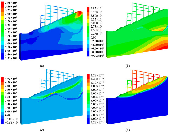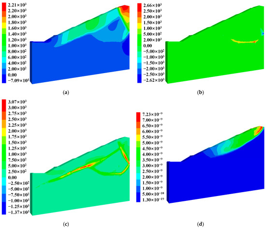 The energy visualization procedure was used to analyze the possible failure modes of the current slope. After initial equilibrium, we reduced the slope strength parameter by 1.153 times and explored the energy evolution at critical failure. The fields of gravitational potential energy loss, elastic strain energy increment, dissipated energy increment, and kinetic energy increment are shown in Figure 23. The gravity potential energy at the top of the slope undergoes the most drastic evolution. The elastic strain energy only significantly increases in a few areas, while there is little change in other areas. The area of sudden increase in dissipated energy extends from the toe of the slope to the top of the slope. The severe area of kinetic energy evolution is concentrated on the free face of the slope.