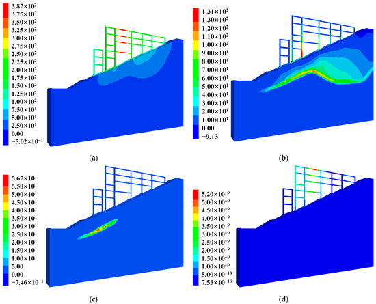 Incremental field of critical failure energy for excavation and support/J/m3: (a) gravitational potential energy loss field; (b) elastic strain energy incremental field; (c) dissipative energy increment field; (d) incremental field of kinetic energy.