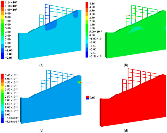 The vertical and horizontal displacements of the original slope at the initial equilibrium state of geostress are shown in Figure 22. The overall settlement amplitude of the undisturbed slope is relatively large, and the area is wide. Except for the bottom of the moderately weathered rock layer, the vertical displacement in other areas ranges from 2 cm to 30 cm, while the horizontal displacement is concentrated on the slope, with a maximum of 9.4 cm. After calculation, the safety factor of the slope is 1.153, which is lower than the safety factor of 1.35 given by the specifications. Therefore, there is a risk of slides occurring on the slope.