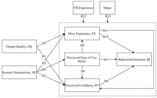 Usage experience and major studied (educational background) were chosen as moderator variables. Usage experience refers to the user’s experience with the VR system or VR environment, while major studied refers to the user’s educational background to understand the differences between users from different majors. Usage experience tends to have an impact on each variable [28,34,35]. Each time a user uses VR, the usage of the system helps in familiarizing them with the characteristics and interaction methods of the VR environment. As the users become more familiar with the VR environment, they gradually accumulate the skills of using VR systems, unconsciously exercising their learning ability. There are many studies on VR that take experience as an important influencing factor. Users who have used VR many times are better able to familiarize themselves with the VR environment and use the VR system to complete tasks. On the contrary, for users who have no experience in using VR, it takes time to use the novelty brought by the VR environment, thus affecting the efficiency of task completion. In addition, it has also been shown in related studies that significant differences in cognitive and behavioral styles of individual users from different professions can occur in performing tasks related to the architectural profession. Therefore, to investigate the influence of different VR usage experiences and different educational backgrounds users on users’ intention to use VR systems, the following hypotheses are proposed: