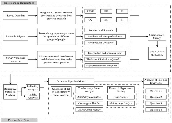Thus, the study illustrates an in-depth understanding of attitudes and behavioral willingness of architectural professionals to apply VR technology in design and evaluation processes to meet the current challenges of design visualization by using VR technology and promote advanced digitization in the field of architectural design. A VR-based exterior design evaluation model was developed for this study and used to examine the user experience of such new visualization methods. Following the use of the developed system, a questionnaire survey of the participants (architecture and non-architecture professionals and students) was conducted to evaluate the proposed model. The questionnaire survey responses were examined using the Technology Acceptance Model (TAM) in conjunction with structural equation modeling. Following the survey, post hoc interviews were conducted to gain an in-depth understanding of the users’ experience while using the VR system. The interview responses were further analyzed to understand the positive and negative implications of the proposed VR model and suggestions for improvement in the future.