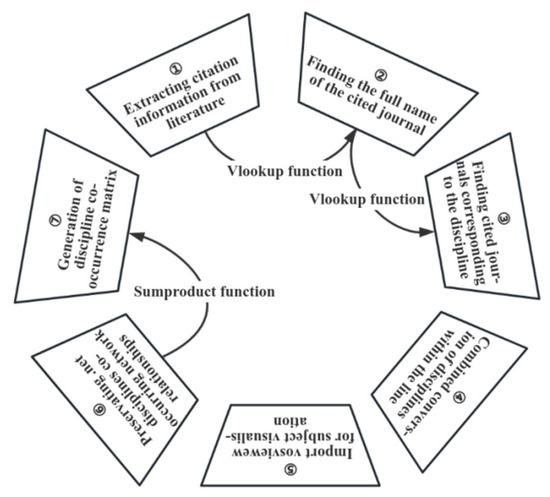This paper analyzed the disciplinary relationships within the field of the built environment using the retrieved literature data. To achieve this, a disciplinary co-occurrence matrix was established by constructing a “journal abbreviation-journal full name-discipline mapping table” [20] based on references. The process is shown in Figure 2.