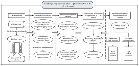 To thoroughly examine the interdisciplinary nature of the built environment field, this study began by collecting the literature data related to the field and constructing a disciplinary co-occurrence matrix. The similarity between the disciplines involved in the field and the disciplinary differences of a single article were then measured using the cosine index and the Rao–Stirling index. Finally, we identified the interdisciplinary topics in the field of the built environment and their evolution through the LDA model. The research framework of this paper is shown in Figure 3.