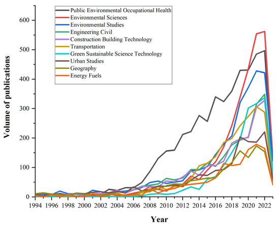 The disciplinary origin of the citing paper on the built environment revealed that it encompassed 237 disciplines. The most dominant category was Public Environmental Occupational Health, followed by Environmental Sciences, Engineering Civil, Construction Building Technology, and other disciplines. Figure 4 displays the top 10 disciplines with the highest number of publications. Regarding the time course, there was less focus on built environment issues before 2005. After that, the discipline of Public Environmental Occupational Health took the lead in paying attention to these issues, which then became a research hotspot. The number of articles per year steadily increased thereafter. In 2014, there was an increase in the attention paid by Environmental Sciences to built environment issues. Since then, the number of articles on this topic has increased rapidly. In the period of 2020–2023, the number of articles on built environment issues exceeded that of Public Environmental Occupational Health, making it a new area of research.