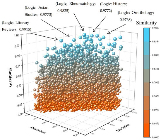By employing the interdisciplinary measurement method detailed in Section 2.2.1, we could determine the distance between the disciplines of reference sources within the built environment field. This distance can be visualized in a 3D scatter plot utilizing the origin software, as depicted in Figure 5. The plot illustrates disciplines along the x and y axes, while the z-axis signifies the distance separating two disciplines. Notably, the highest frequency of discipline combinations with distances ranging from 0.4 to 0.6 was observed. Logic was mentioned in only one document, and co-occurred with only a few disciplines in this article, resulting in low similarity values between Logic and most other disciplines and large disciplinary distances. The disciplines with the largest disciplinary distances in Figure 6 were all intersections between Logic and other fields such as Literary Reviews, Asian Studies, Rheumatology, History, and Ornithology. These disciplines were cited in articles in the field of the built environment to provide an interdisciplinary idea and a theoretical basis for research. Therefore, it is suffice to say that the field of the built environment covers a wide range of research topics and has a high degree of interdisciplinary research.