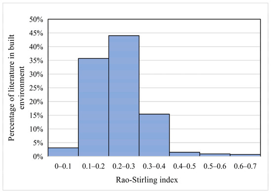 This paper calculated the Rao–Stirling variability metrics of the 16,948 literature sources using R 4.3.2. We also carried out a frequency distribution of the disciplinary variability indices of literature in the built environment field, and present the results of the interdisciplinary measurement of the literature in this field, as shown in Figure 7. The disciplinary variability value of most literature was concentrated in the range of 0.1–0.4. The larger the index, the higher the degree of interdisciplinary. This article set a threshold value of 0.35 and defined literature with a Rao–Stirling index greater than 0.35 as highly interdisciplinary literature in the field of the built environment. Finally, 994 pieces of literature were selected for interdisciplinary topic identification research in the field of the built environment.