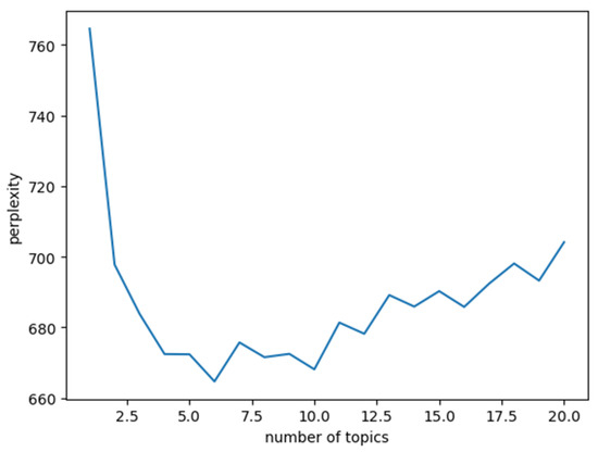 The identification of interdisciplinary topics can facilitate a scholarly exploration of novel research avenues and foster collaborative communication across various fields. In this study, abstracts from interdisciplinary documents within the built environment domain were analyzed using an LDA model to discern their underlying topics [39]. The Sklearn Python library was employed to automatically extract semantic topics from the documents, while the latent Dirichlet allocation algorithm was utilized to uncover the semantic structure of the documents by examining the statistical co-occurrence of words within a corpus of training documents. The algorithm, which utilizes Python 3.11.0, enables the selection of a range of 1 to 20 topics. The perplexity of each individual topic number was computed independently, leading to the generation of a perplexity curve, as depicted in Figure 8. Analysis of the curve revealed that selecting six topics yielded a lower model perplexity, hence the decision to set the model’s number of topics to six.
