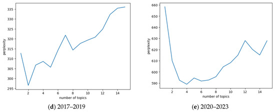 This study examined the interdisciplinary literature across five distinct time periods: 1995–2009, 2010–2013, 2014–2016, 2017–2019, and 2020–2023. The division of these phases was determined by the presence of adequate textual data, with approximately equal numbers of documents in each phase. The optimal number of topics within the literature for each time interval was identified using the perplexity parameter of the LDA model. Specific calculation results are presented in Figure 10.