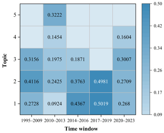 The results of the LDA topic model can be used to calculate the intensity of the topic under each time window [40]. This is defined as topic hotness or topic attention, which indicates the degree of attention to a topic over a specific period. This quantitative index can be used to assess whether a research topic is a scientific research hotspot. Origin 2021 was employed to generate a topic heat map (Figure 11). The graph displays the intensity of topics through varying colors, with darker shades denoting higher levels of intensity and lighter shades denoting lower levels. The numerical value corresponds to the intensity of the topic. The figure illustrates the concentration of hot topics in the field of the built environment, namely population health, digitization of historical heritage, indoor environment, building information modeling, and urban planning and design. Among the most prominent intersections in the field of the built environment were those related to population health, the digitalization of historical heritage, and the indoor environment. These were followed by building information modeling, urban planning and design, urban environment, and then building insulation materials, sustainable design, and so on. The built environment exerts a profound influence on the health and well-being of residents. This is evident in the planning and design of cities, the provision of community amenities, the greening of urban areas, and the construction of roads, among other factors. The discipline of built environment research draws on a range of theoretical frameworks including urban planning, environmental psychology, behavioral geography, and others. The protection and renovation of historic buildings represent a significant aspect of urban renewal. Some scholars have employed BIM (building information modeling) technology and visualization technology to create three-dimensional digital models and digital platforms for historical buildings, intending to achieve the protection and renovation of historical buildings.