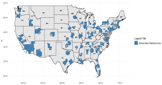 The third dataset—HUD’s LIHTC Database—also provides each LIHTC projects’ detailed information, which includes the location, the number of units, and the year placed in service. This dataset contains the record of LIHTC developments from 1987 to 2023. Since this study is focused on developments from 2010 to 2015, 7874 projects—placed in service from 2010 to 2015—were retrieved from the total 53,032 observations, LIHTC developments from 1987 to 2023. The total number of LIHTC units provided through the 7874 projects from 2010 to 2015 in the 101 MSAs was 418,304, comprising approximately 70% of the total LIHTC units provided from the LIHTC program across the whole nation between 2010 and 2015.
