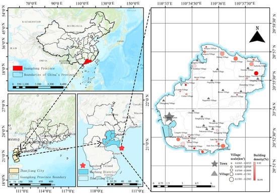 Based on field research and measurement data from Google Earth aerial images, the village scale is divided into five categories (Table 2). A statistical analysis of the village scales of 42 coastal villages on Naozhou Island (Table A1) reveals significant variations in scales among these villages. The smallest village is Dingdang Village, located on the eastern side of Naozhou Island, with an area of only 0.029 km2; the largest village is Tianxuan Village, also on the eastern side of Naozhou Island, with a total area of 0.26 km2. In terms of the proportional distribution of village scales, micro-scale villages (0.01–0.04 km2) and super large-scale villages (greater than 0.2 km2) account for a small proportion, both at 7.1%; large-scale villages (0.1–0.2 km2) account for 16.7%; small-scale villages (0.04–0.1 km²); and medium-scale villages (0.07–0.1 km2) are the most common on Naozhou Island, each accounting for nearly one-third, at 38.0% and 31.0%, respectively.