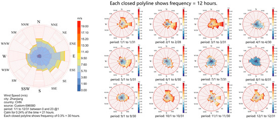 Naozhou Island is an island located in the southeastern part of Zhanjiang City, Guangdong Province, formed approximately 200,000 to 500,000 years ago by underwater volcanic eruptions. It is also the largest volcanic island in China, bordered by Donghai Island to the north, Leizhou Bay to the west, and the South China Sea to the southeast, with a total area of about 56 square kilometers (Figure 1). Naozhou Island is situated in a subtropical monsoon zone, with prevailing easterly and southeasterly winds from April to September. From October to March of the following year, northerly and northeasterly winds dominate (Figure 2). Additionally, the island is often affected by typhoons to varying degrees during the summer. These typically occur from May to November, with the majority happening from July to September [27]. This results in two distinctly different states of wind conditions along the coastal areas throughout the year. One is a relatively stable and common state, known as the normal state; the other is an extreme and abnormal state, characterized by strong winds and heavy rainfall brought by typhoons and other extreme weather conditions.
