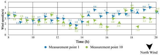 From Figure 4, it can be seen that between 8:00 and 20:00, the wind field in Yingming Village exhibits multiple regular fluctuations of “rise/fall.” Taking measurement points 1 and 10 as examples, both points are direct wind sources from the southern seaside, and their wind speed and direction throughout the day are relatively close. Measurement point 1 is closest to the seaside, with no plants or structures obstructing it. The average wind speed at measurement point 1 throughout the day is 3.3 m/s, with a maximum wind speed of 4.6 m/s, and the predominant wind direction is southeast. In the morning, the wind speed is relatively stable, averaging 3.0 m/s, while, in the afternoon, the wind speed increases and varies significantly. The average wind speed at measurement point 10 throughout the day is 2.8 m/s, with the main wind direction being south and a maximum wind speed of 4.5 m/s. The wind speed in the morning is relatively stable, but in the afternoon, influenced by surrounding vegetation, the fluctuations in wind speed and direction at measurement point 10 are more pronounced compared with measurement point 1.