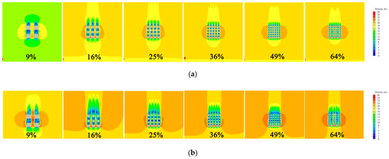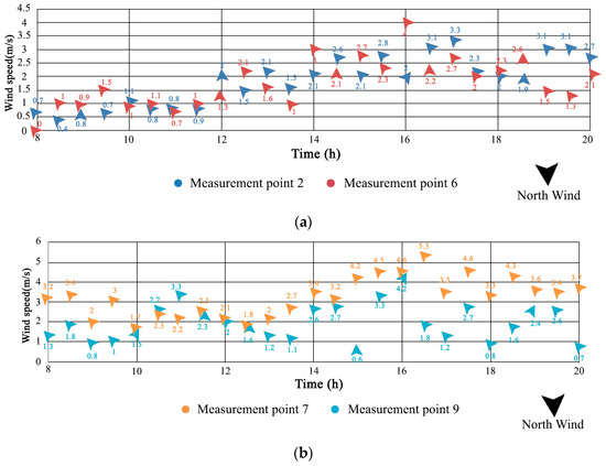 Figure 5. Wind speed and direction at measurement points of two wind channels: (a) wind channel 4; (b) wind channel 9.