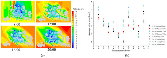 Figure 6. Measured and simulated analysis of Yingming Village. (a) Simulated wind speed cloud map at four moments; (b) comparison of simulated wind environment values and measured values.