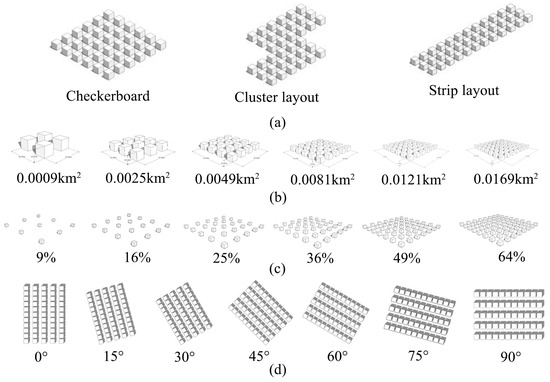 To accurately analyze the wind environment characteristics of the villages on Naozhou Island, 27 villages with clear planning and uniform building orientations were selected from a total of 42 villages for in-depth discussion (Table A2). In contrast, scattered layout villages, due to their lack of fixed orientations and flexible distribution within a certain distance, exhibited a disordered and discrete overall pattern, which significantly increased the complexity and difficulty of wind environment simulation. Therefore, in this study of the wind environment simulation of coastal villages on Naozhou Island, scattered layout villages were not included in the analysis. Additionally, based on the results of field investigations of the spatial forms of the selected villages, we constructed four sets of models in the software simulation. In the model settings, the height of the buildings and the spacing between buildings were kept constant at 10 m (Figure 7). By adjusting the spatial form index values of each model group, we analyzed the changes in the village wind environment under different spatial form index values and two wind conditions (the normal wind condition being a southeast wind at a speed of 2.57 m/s; the extreme wind condition being an east wind at a speed of 21.70 m/s).
