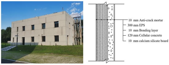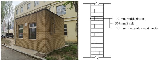 The test objects of this study are three buildings with different thermal insulation performances located within a university campus in Shenyang, China. During the coldest months of winter in Shenyang, the average temperature typically ranges around −10 °C, with the lowest temperature reaching as low as −30 °C. In the climate zone classification of China, Shenyang belongs to the severe cold region. The three building cases can be categorized based on their insulation performance as follows: a brick-wall building without insulation, a conventionally insulated building, and a nearly zero-energy building. The exterior appearance and external wall structures are illustrated in Figure 1, Figure 2 and Figure 3, while information on building materials is provided in Table 2. Before the experiment, qualitative inspections of all the tested walls were conducted using an infrared thermal imager. The surface temperatures of the target walls are uniform, without any significant thermal defects or temperature anomalies.