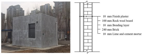 - Case 2 is a single-story building with a ceiling height of 2.8 m, covering an area of 20 m². It was constructed in 2023. The building is utilized as a pump room with insulation requirements. The main materials of the exterior walls are 240 mm non-clay solid brick walls and 100 mm hydrophobic rock wool boards. The insulation capacity meets the design requirements of the national standard “Design Standard for Energy Efficiency of Public Buildings” []. Newly constructed buildings in China are required to comply with energy efficiency design requirements based on this standard.