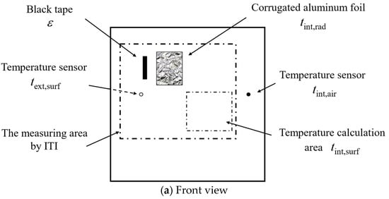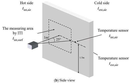 The specifications of the experimental equipment are shown in Table 4, all of which have automatic data-recording capabilities. The layout of the equipment and measuring points is shown in Figure 4, considering that the influence of the vignetting effect of the infrared thermal imager should be avoided [,,]. Temperature sensors are placed on both sides of the wall to assist in verifying the temperature data obtained from the infrared thermal imager.