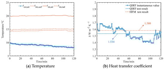 To avoid the influence of solar radiation, formal data recording was initiated at 11:00 PM at night. The duration of the test was no less than 2 h. All testing equipment automatically recorded data every one minute. The number of consecutive valid temperature data points was not less than 120 []. Human activities should be controlled to avoid causing abnormalities in the radiation heat transfer temperature and indoor air temperature. The average temperature of each pixel is calculated within the infrared monitoring range as the internal wall surface temperature. The instantaneous heat transfer coefficient at each time point within the time series is calculated by using Equations (1)–(7). The arithmetic mean of these values is computed to obtain the final test result for the QIRT method.