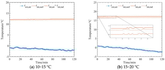 The radiative heat transfer on the inner surface of the building wall is the radiative exchange between the wall and the indoor surroundings. According to the Stefan–Boltzmann Law, the radiative heat transfer power can be calculated according to Equation (2).
