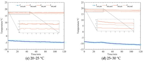In the subsequent two sets of experiments, the Δt respectively increased to 20~25 °C and 25~30 °C. From Figure 6, it can be observed that as the Δt increases, the difference between tint,air and tint,surf also becomes larger, with its average value eventually exceeding 1 °C. The test results of the QIRT method are 0.258 W/(m2·K) and 0.256 W/(m2·K), respectively, with relative errors not exceeding 10%, demonstrating good testing performance in both cases. However, within the 25~30 °C range, the distribution of the three temperature data sets (tint,air, tint,surf, and tint,rad) becomes more pronounced. A higher Δt is more advantageous for on-site testing operations and data processing. From the standard deviation data of the instantaneous heat transfer coefficient obtained by the QIRT method in Table 5, it is evident that the dispersion of the instantaneous heat transfer coefficient in the 10~15 range is noticeably higher than the other three groups. This phenomenon is also reflected in Figure 7, providing another perspective on how temperature difference affects the stability of heat flow in the testing environment. For building case 2, in order to achieve satisfactory results with the QIRT method, the Δt needs to be maintained at 20 °C or above.