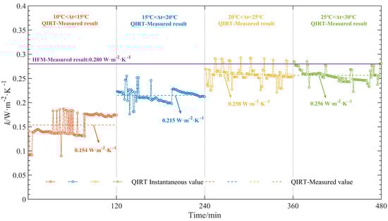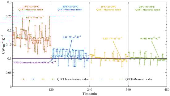 In the subsequent four sets of tests, the indoor active heating device was activated. Tests with higher temperature differences were conducted respectively. The temperature data variations are illustrated in Figure 9. Table 6 displays the accuracy of the QIRT method test results. The variation of the instantaneous heat transfer coefficient within different temperature-difference ranges can be observed in Figure 10.