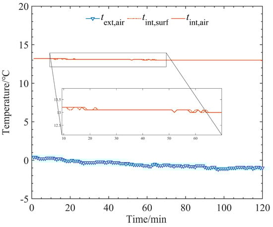 The on-site testing was conducted from January to March 2024. The indoor air was heated using electric heaters for 24 h before formally recording the data []. The indoor air temperature was monitored using temperature sensors to ensure it remained above 15 °C until the end of the testing, aiming to reduce the influence of wall thermal inertia. Throughout the testing process, the hourly variations in outdoor air temperature did not exceed 5 °C, and the wind speed was not higher than 1 m/s. There was no radiation impact from sources such as indoor lighting.