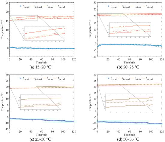 From January to February 2024, five sets of tests were conducted on building case 3, each with different Δt. In the first set of tests, the indoor active heating device was not activated. The Δt was maintained between 10 °C and 15 °C. Figure 8 illustrates the temperature variations at each measurement point. For highly insulated nearly zero-energy buildings, the tint,air generally remains consistent with the tint,surf during prolonged monitoring. In such a scenario, QIRT testing cannot be conducted. The inner wall surface maintains a relative thermal equilibrium with the indoor air. Effective thermal insulation of the walls can minimize heat loss from the building, maintaining a stable indoor temperature and thereby significantly reducing energy consumption. Under temperature differences within 15 °C, stable indoor temperatures can be maintained without the need for active heating.