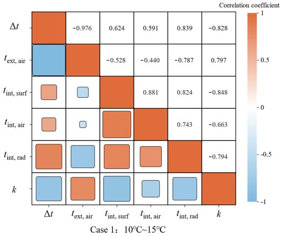 Figure 11 shows the correlation matrix for building case 1 under a temperature difference of 10 °C to 15 °C. At this point, the thermal environment has become essentially stable. It can be observed that each temperature datum is highly correlated with the instantaneous heat transfer coefficient. Among them, the tint,surf has the highest correlation (r = −0.848). Following that are the Δt, text,air, and tint,rad, all with correlation coefficients reaching 0.79 or above.