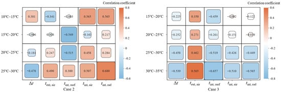 The correlation matrix of building case 2 exhibits different patterns. When the Δt is between 10 °C to 15 °C, the influence of the tint,surf is minimal, while the influence of tint,air and tint,rad is maximal. In the 15~20 °C range, the influence of the tint,surf becomes maximal, followed by the tint,rad, while other temperatures do not exhibit correlation. This explains the variation in the instantaneous heat transfer coefficient at 75 min in Figure 7. When the Δt is above 20 degrees, the correlation of each temperature datum increases. Until the high Δt range of 25~30 °C, all temperature data exhibit strong correlation, with the tint,rad having the greatest impact. Analyzing the reasons for the change in correlation level, besides the different insulation performance of the tested walls, the indoor space of case 2 is significantly smaller than that of case 3. In a confined space environment, the activation of the heating device may cause air movement, which could affect the variation of temperature data. Additionally, the building type of case 2 is the equipment room. The equipment units within the room generate a certain amount of uncontrollable heat, which can introduce uncertainty into the temperature data.