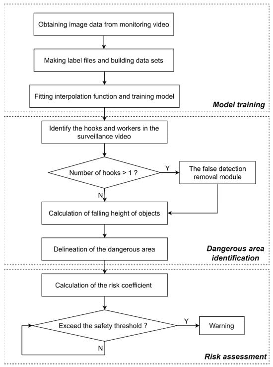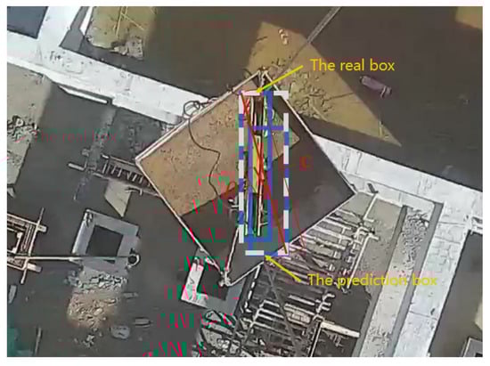 - The identification part of the falling object striking area. After detecting the hook and construction personnel using the trained improved algorithm, the actual height of the hook is calculated using the interpolation function based on the hook size, and the range of the falling object striking point is determined to delineate the dangerous area.