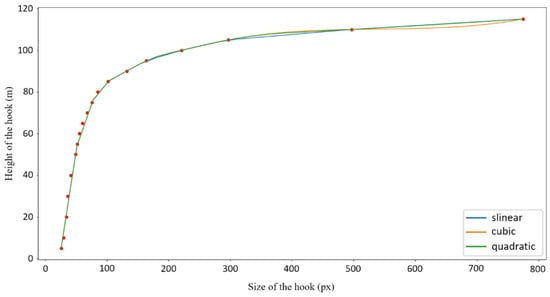 - Interpolation function determination: Capture a segment of video data of the crane hook moving uniformly from the lowest to the highest point. Extract images at equal time intervals and use the time information to determine the crane hook’s height. Record discrete data points containing the crane hook’s height and size, and apply a second-order spline curve interpolation method to generate continuous functions, obtaining interpolation functions for both the crane hook’s height and size.