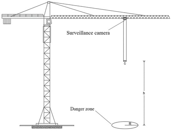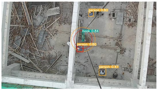 - Dangerous area demarcation: Employ the dangerous area identification module within the detection model. This module defines the dangerous area directly beneath the crane hook in the surveillance video, which is based on the method for determining the range of falling object striking points. The dangerous area is marked with a red circle and is displayed in real-time in the surveillance video.