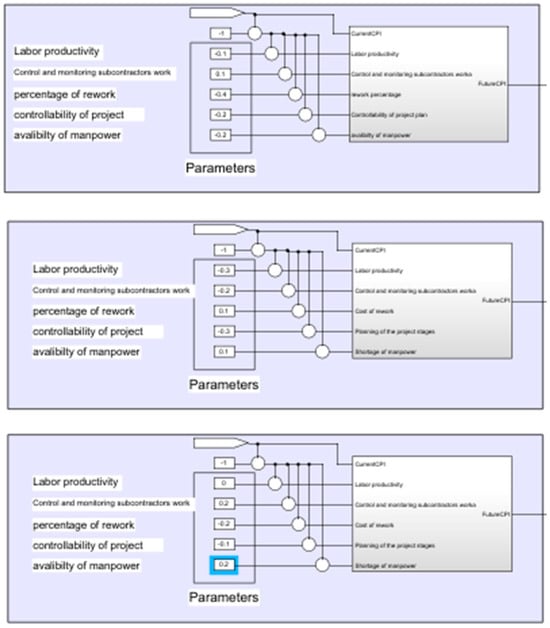 Table 3, the results, including the ranking weights, are based on the respondents’ inputs. The model was developed using only the top five highest-ranking factors, which were carefully reviewed by experts and drawn from the literature. These factors include controllability of the project plan, labor productivity, management of subcontractors, percentage of rework, and availability of manpower. For simplicity, as agreed by the experts, only these five factors were included in the model. However, the model is flexible and can accommodate additional factors if necessary. The weights assigned to these factors are used to define the fuzzy number for the future CPI, which is then applied to forecast the project’s final cost.