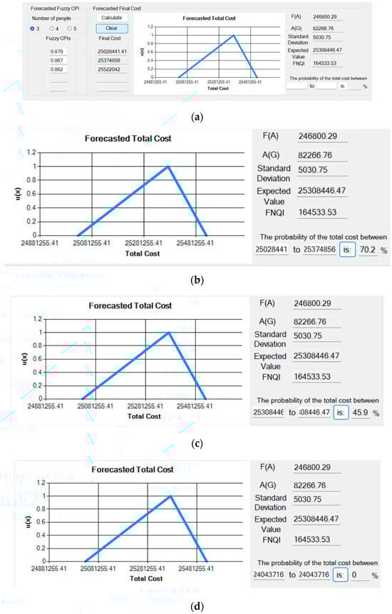 The resultant values from defuzzification represent the future fuzzy CPI for each team member. Subsequently, the projected final cost of the construction project for each future CPI was calculated, followed by conducting a risk analysis based on team input. The risk analysis assessed the probability of the forecasted final project costs falling between the maximum and minimum fuzzy values. The formula for this probability calculation is as follows: